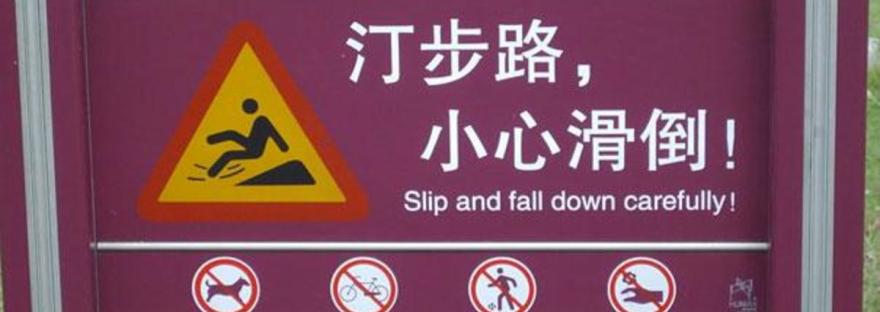 “Slip carefully” is the Google Translate for 小心滑倒, a common sign in Chinese for “Caution, Slippery”. Hilarious fails aside, we have to say Chinese-English translation can be tricky. Sometimes, what seem to make sense logically from the translators’ point of view, is spectacularly wrong for the audience. Here are four most common reasons for translation… Continue reading Not so lost in Translation 2